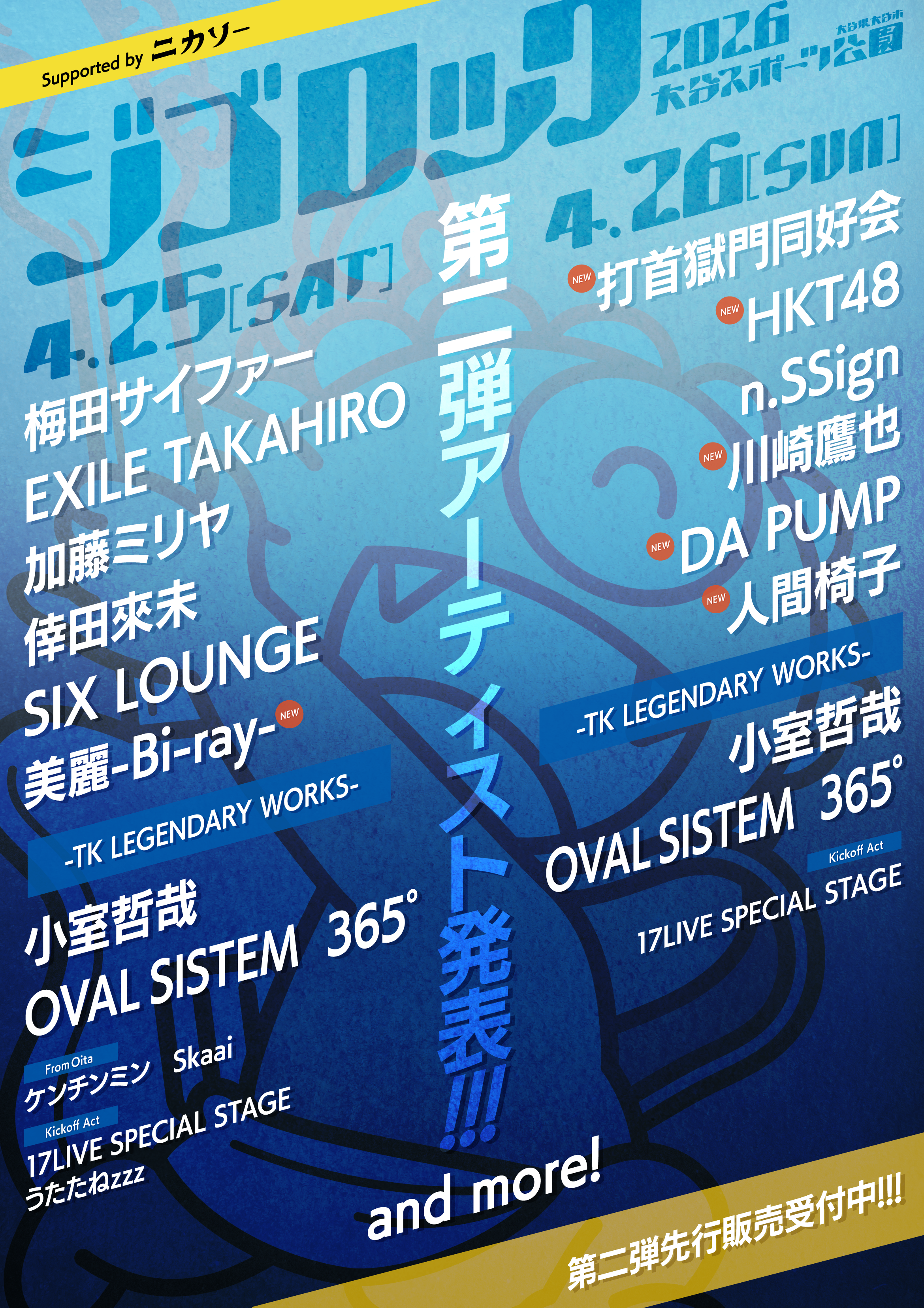 NEWS SCHEDULE VIDEO DISCOGRAPHY FAN CLUB PROFILE ONLINESHOP CONTACT SCHEDULE 2026.01.30 ジゴロック2026 supported by ニカソー SHARE SHARE SHARE 4/26(日)「ジゴロック2026 supported by ニカソー」に出演決定✨ 第二弾先着先行もスタート🔥 詳細はURLをチェック☑️ ▼日程&会場 4/25(土)〜4/26(日) ※川崎の出演日は4/26(日)です。 @大分・大分スポーツ公園 ▼イベント公式サイト https://jigorock.com/_2026/ ▼第二弾先着先行ページ https://eplus.jp/jigorock/ BACK
